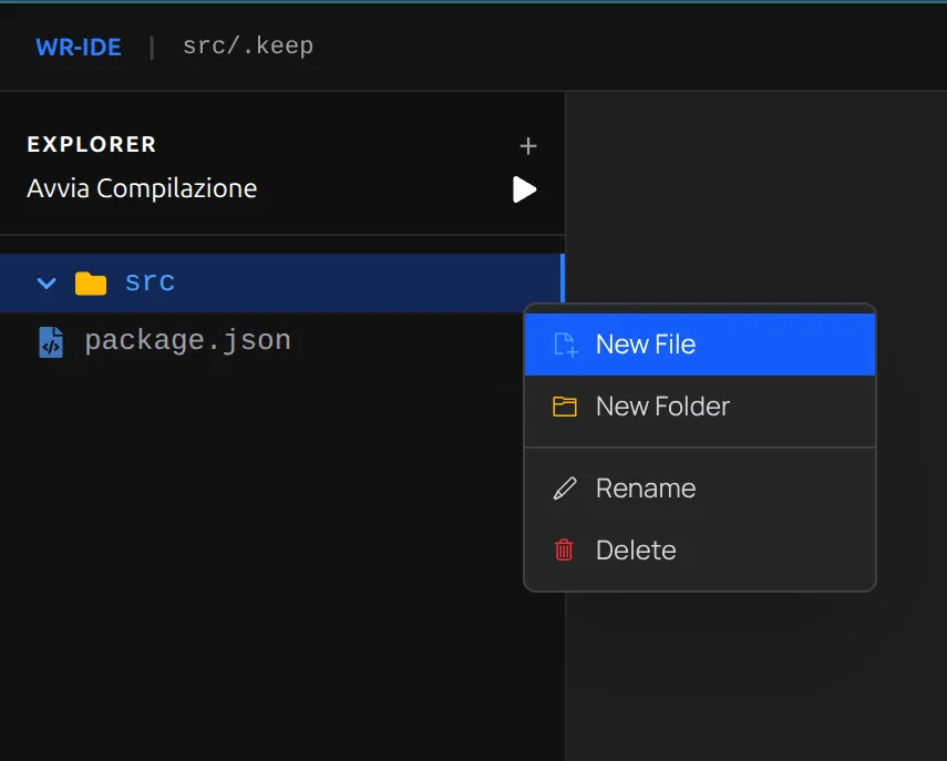First, let's create a package.json file by right-clicking on an empty area of the sidebar:
