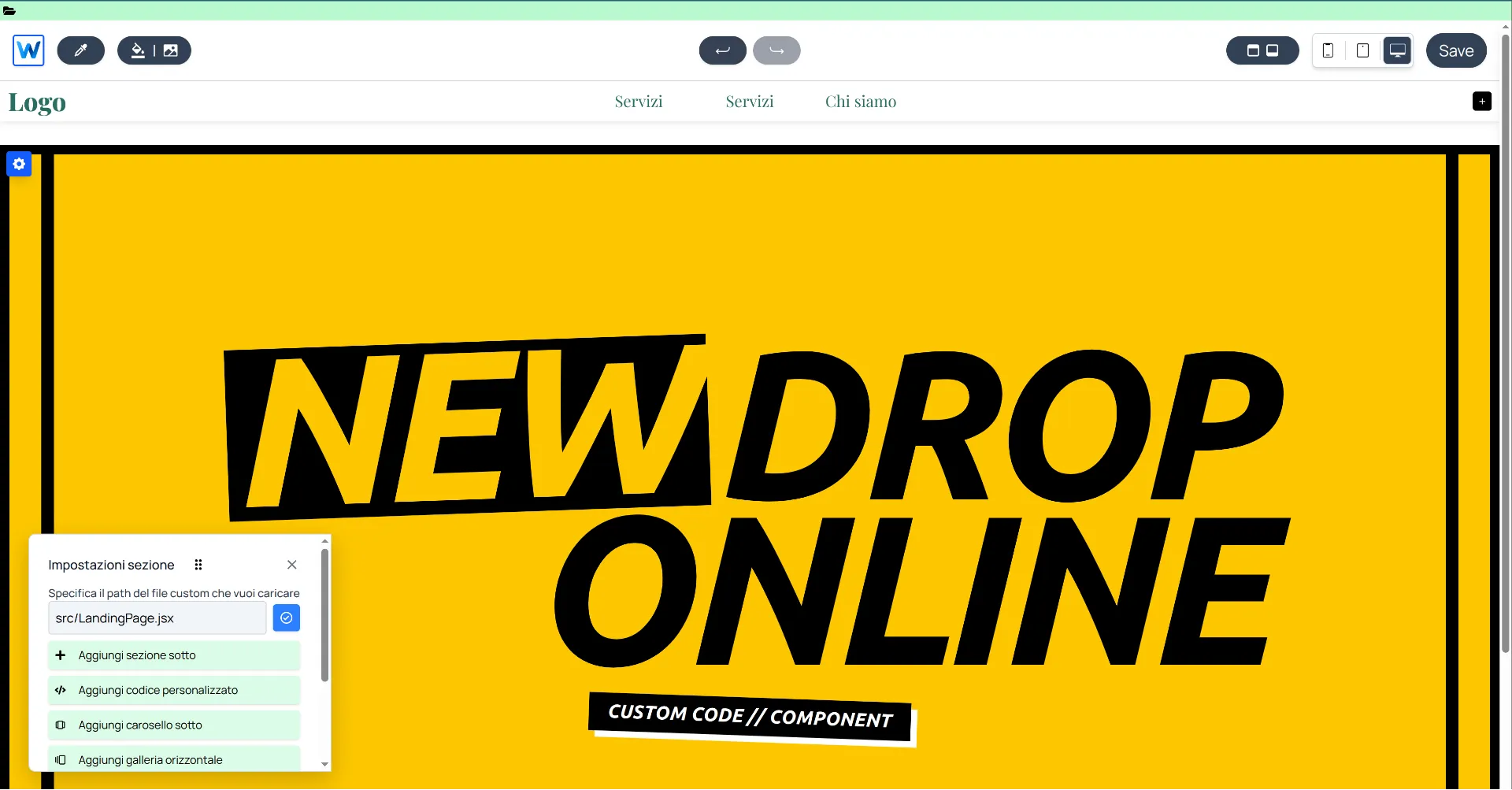 - Custom Section: An independent block inserted directly into the editor. It is ideal for visible sections like landing page components, visible external integrations, and more.