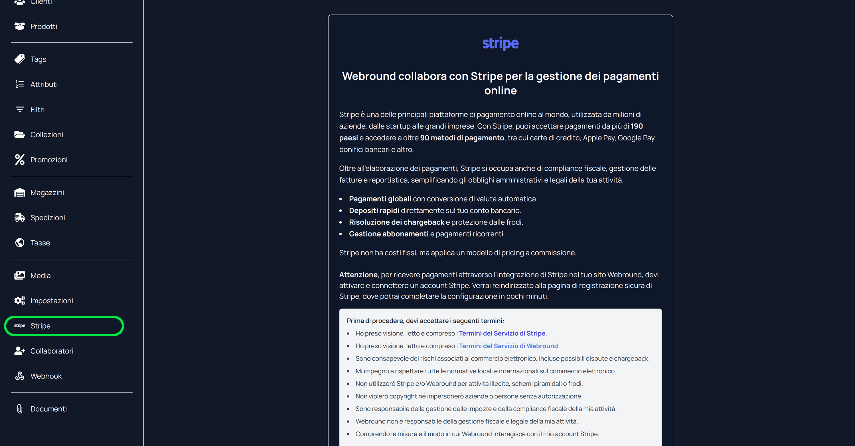 From a KYC (Know Your Customer) perspective, Webround does not assume direct responsibility, as the Stripe Connect Standard integration requires a fully independent merchant account connected to the platform. Webround does not collect nor require personal or payment information from the merchant, delegating this task to Stripe instead, which is an entity of proven reliability.