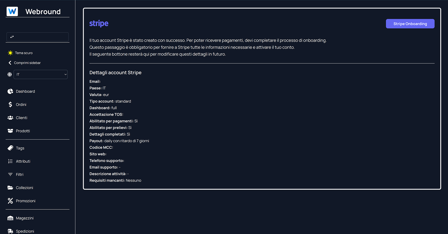 The solution is immediate: Click on the purple "Stripe Onboarding" button and log in. Even without saving any changes, exit the Stripe portal and return to Webround. At that point, you will have triggered a manual synchronization in our systems, which will recognize the latest status of your Stripe account shared with Webround.
