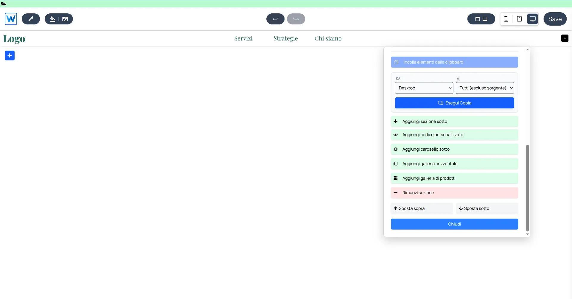 - Sezione Custom: Un blocco indipendente inserito direttamente nell'editor. È ideale per sezioni visibili come componenti delle landing pages, integrazioni esterne visibili e molto altro.