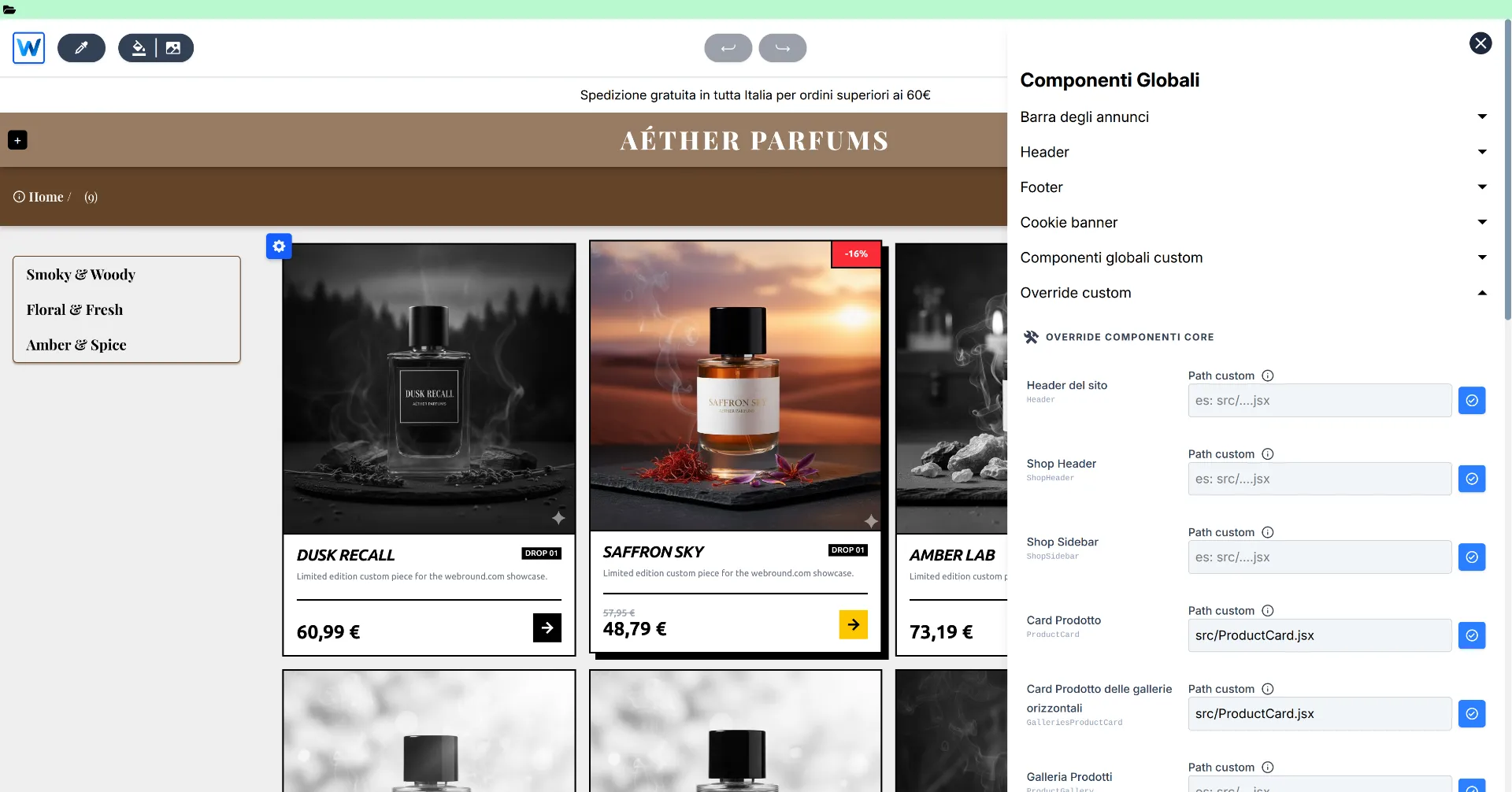 Ora compila il nuovo codice, attendi che sia pronto e accedi al menù degli override dei componenti globali. Accedi alla proprietà "Card Prodotto" e inserisci src/ProductCard.jsx. Recati nello shop e consulta il tuo catalogo: vedrai delle card prodotto complesse e totalmente rinnovate rispetto alle banali card standard di Webround.