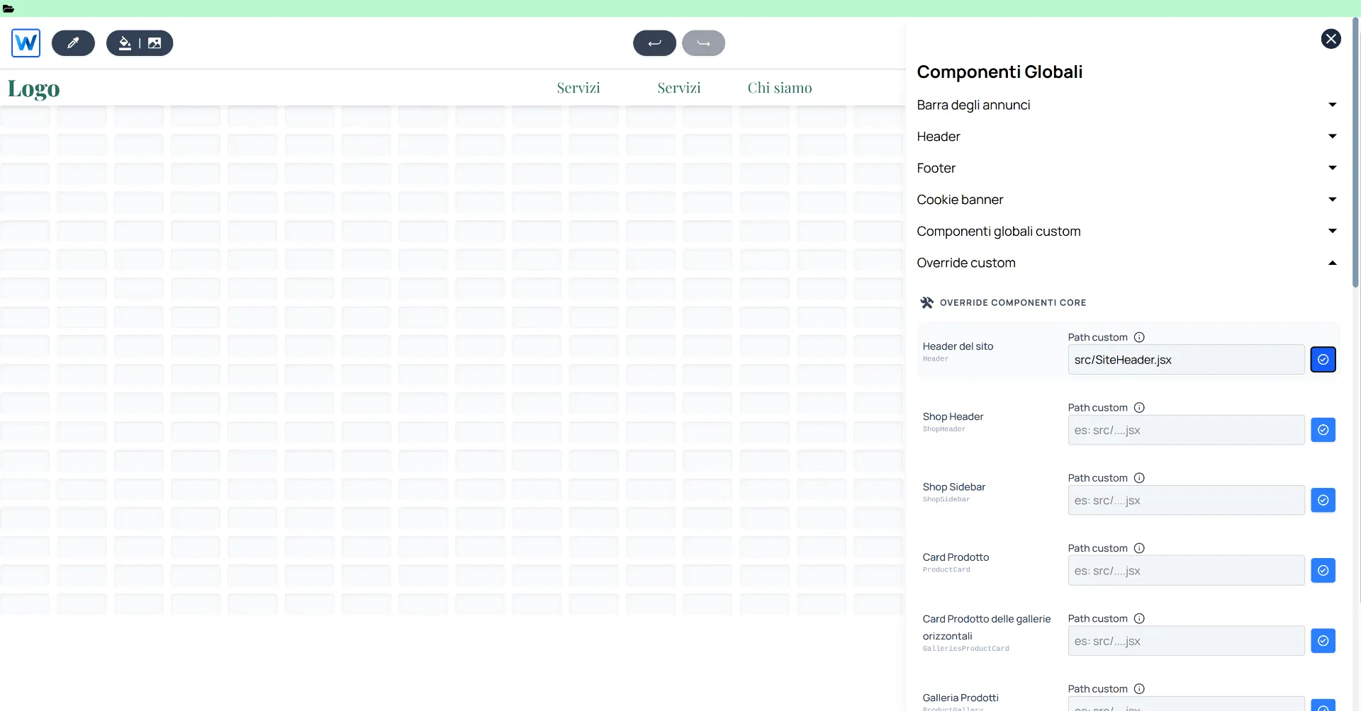 Accedi al menù di gestione dei componenti globali che trovi nell'header dell'editor e apri la sezione "Override custom":
